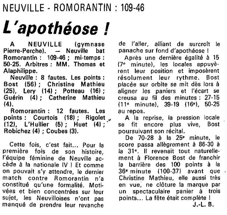 Saison 1986-1987 : Lors de la Journée du 29 Mars 1987, en Championnat de Régionale Féminine 1, Neuville bat Romorantin
