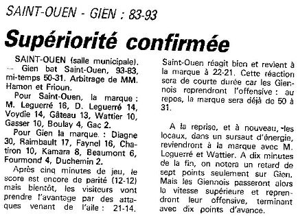 Saison 1986-1987 : Lors de la Journée du 29 Mars 1987, en Championnat de Régionale Masculine 1, Gien bat Saint-Ouen