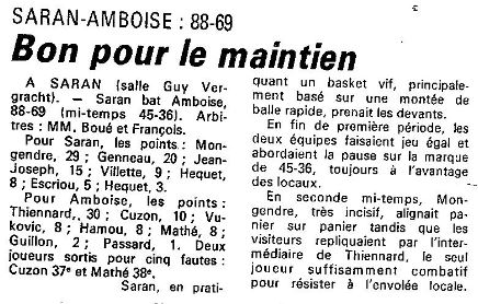 Saison 1986-1987 : Lors de la Journée du 29 Mars 1987, en Championnat de Régionale Masculine 1, Saran bat Amboise