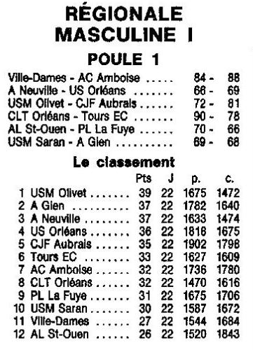 Saison 1986-1987 : Résultats et Classement Définitif après la Journée du 12 Avril 1987 du Championnat de Régionale Masculine 1