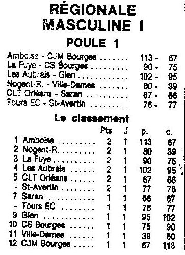 Saison1987-1988 : Résultats et Classement après la Journée du 28 Septembre 1987 du Championnat de Régionale Masculine 1