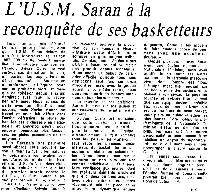 Saison 1987-1988 : Début de Saison difficile pour les Basketteurs de l’USM Saran