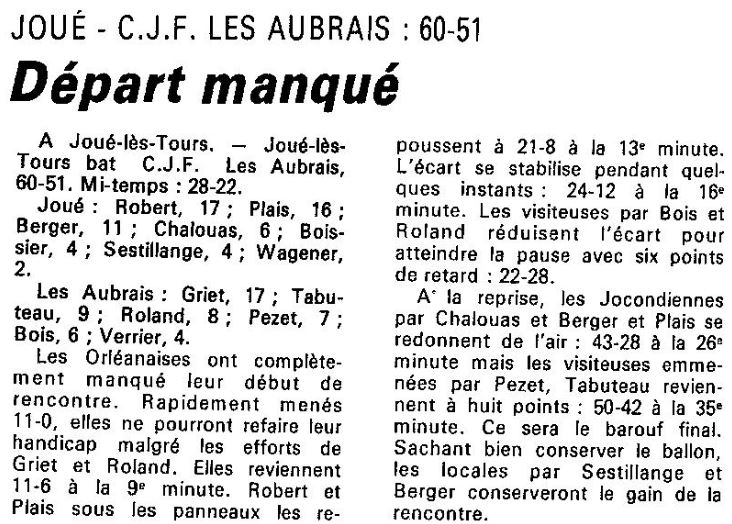 Saison 1987-1988 : Lors de la Journée du 11 Octobre 1987, en Championnat de Régionale Féminine 1, Joué lès Tours bat le CJF Les Aubrais