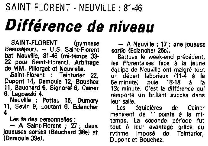 Saison 1987-1988 : Lors de la Journée du 11 Octobre 1987, en Championnat de Régionale Féminine 1, Saint-Florent bat Neuville