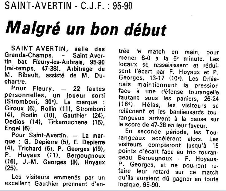 Saison 1987-1988 : Lors de la Journée du 8 Novembre 1987 en Championnat de Régionale Masculine 1, Saint-Avertin bat le CJF