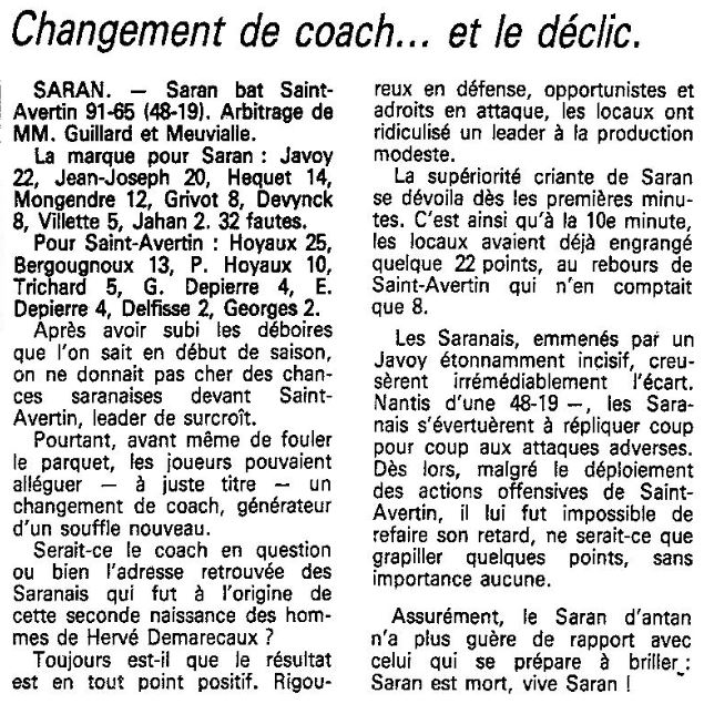 Saison 1987-1988 : Lors de la Journée du 15 Novembre 1987 en Championnat de Régionale Masculine 1, Saran bat Saint-Avertin