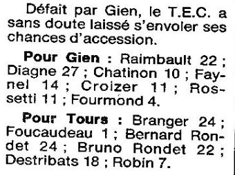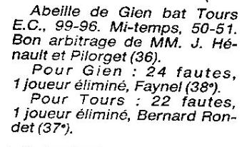 Saison 1987-1988 : Lors de la Journée du 3 Janvier 1988 en Championnat de Régionale Masculine 1, Gien bat le Tours EC