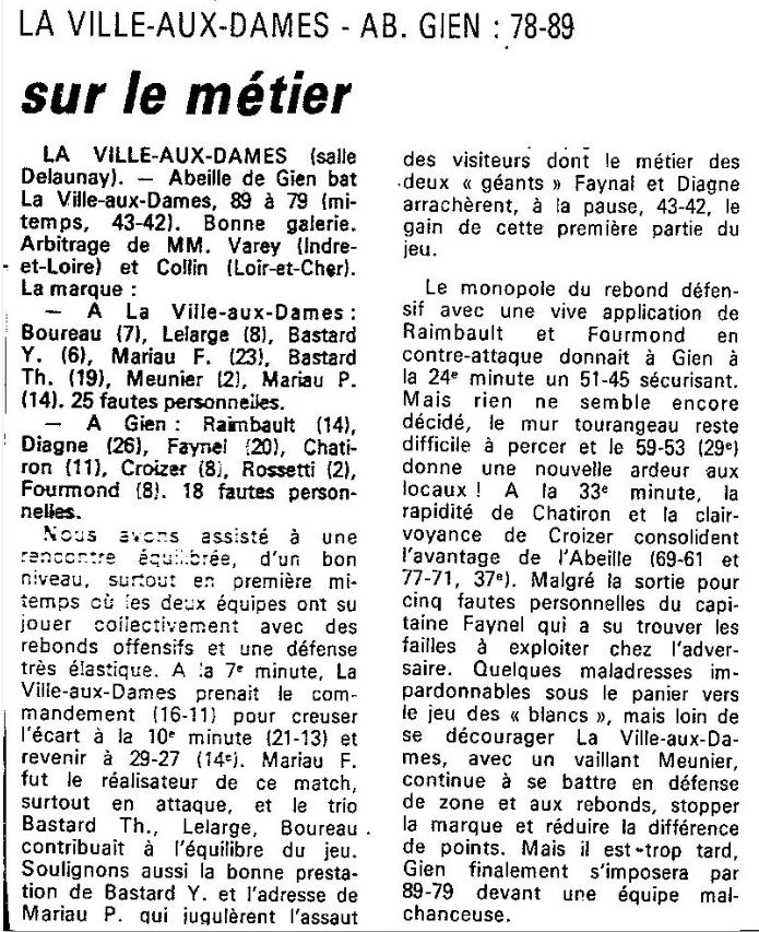 Saison 1987-1988 : Lors de la Journée du 21 Février 1988 en Championnat de Régionale Masculine 1, Gien bat La Ville aux Dames