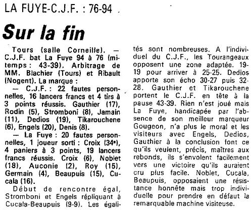 Saison 1987-1988 : Lors de la Journée du 21 Février 1988 en Championnat de Régionale Masculine 1, le CJF bat le PL La Fuye