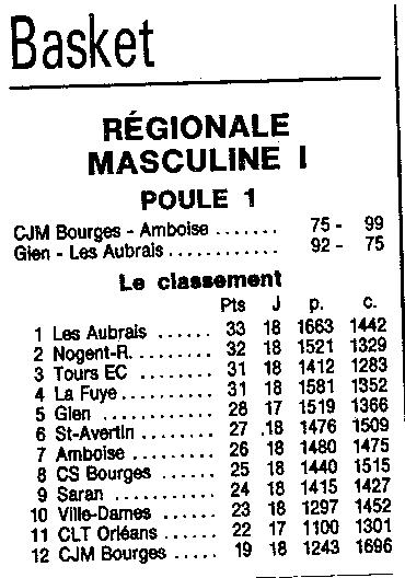 Saison 1987-1988 : Résultats et Classement après la Journée du 28 Février 1988 du Championnat de Régionale Masculine 1