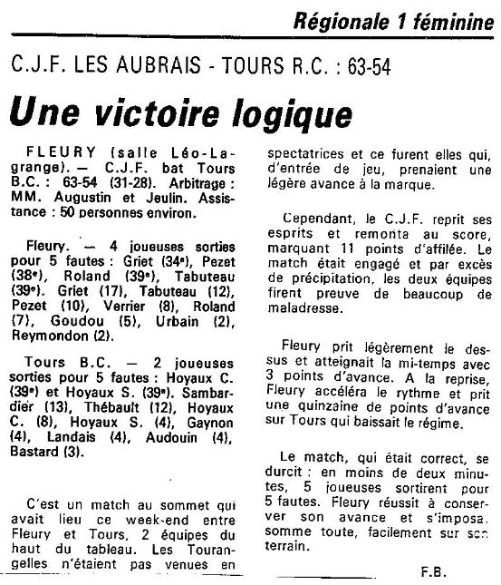 Saison 1987-1988 : Lors de la Journée du 6 Mars 1988 en Championnat Régionale Féminine 1, le CJF bat Tours BC