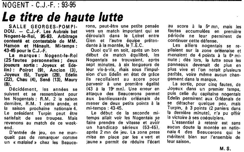 Saison 1987-1988 : Lors de la Journée du 27 Mars 1988 en Championnat de Régionale Masculine 1, Le CJF bat Nogent
