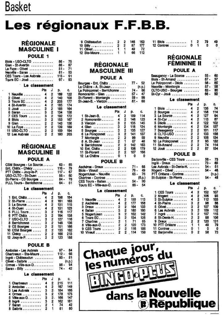 Saison 1988-1989 : Résultats et Classements après la 2ème Journée des Championnats Régionaux