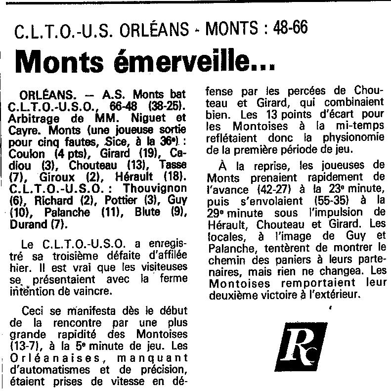 Saison 1988-1989 : Lors de la 4ème Journée du Championnat de Régionale Féminine 1, Monts bat le CLTO-US Orléans