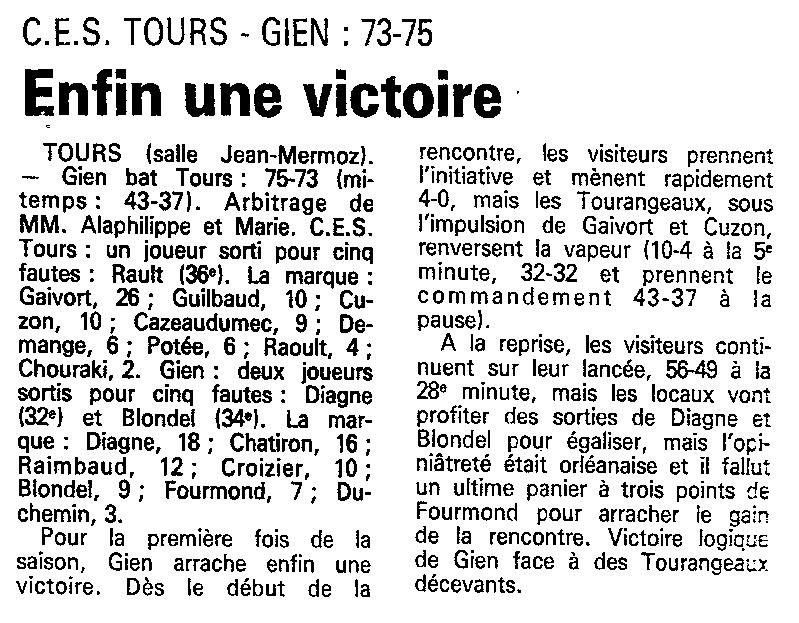 Saison 1988-1989 : Lors de la 8ème Journée du Championnat de Régionale Masculine 1, Gien bat le CES Tours
