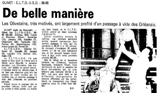 Saison 1988-1989 : Lors de la 8ème Journée du Championnat de Régionale Masculine 1, Olivet bat le CLTO-USO