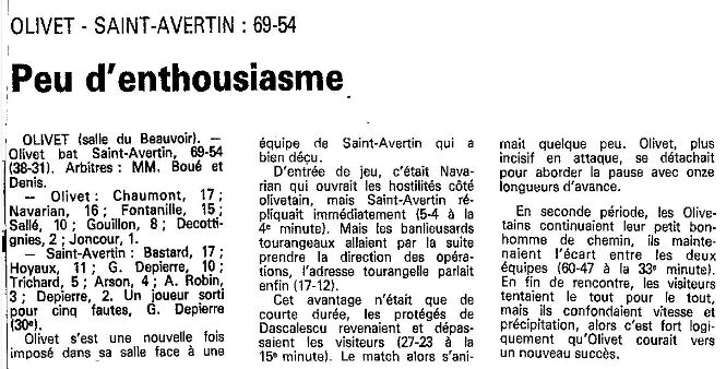 Saison 1988-1989 : Lors de la 11ème Journée du Championnat de Régionale Féminine 1, Olivet bat Saint-Avertin