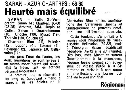 Saison 1988-1989 : Lors de la 11ème Journée du Championnat de Régionale Féminine 1, Saran bat Azur Chartres