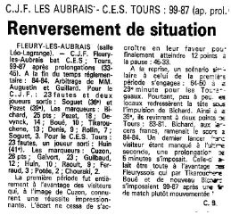 Saison 1988-1989 : Lors de la Journée du 15 Janvier 1989 en Championnat de Régionale Masculine 1, le CJF Les Aubrais bat le CES Tours