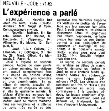 Saison 1988-1989 : Lors de la Journée du 22 Janvier 1989 du Championnat de Régionale Féminine 1, Neuville bat Joué-lès-Tours