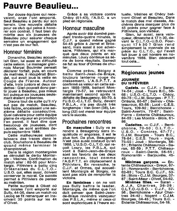 Saison 1988-1989 : Commentaires sur la Journée du 19 Février 1989 des Championnats Départementaux du Loiret