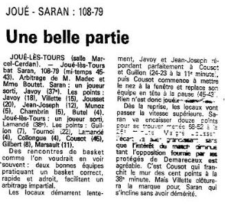 Saison 1988-1989 : Lors de la Journée du 26 Février 1989, en Championnat de Régionale Masculine 1, Joué bat Saran