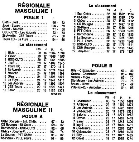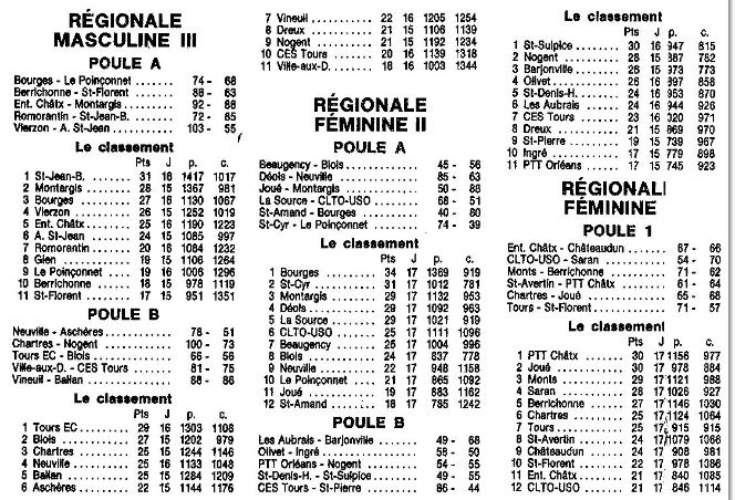 Saison 1988-1989 : Résultats et Classements après la Journée du 26 Février 1989 des Championnats Régionaux