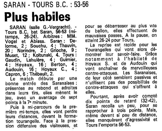 Saison 1988-1989 : Lors de la Journée du 5 Mars 1989 en Championnat de Régionale Féminine 1, Tours BC bat Saran