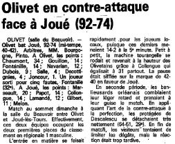 Saison 1988-1989 : Lors de la Journée du 19 Mars 1989, en Championnat Régionale Masculine 1, Olivet bat Joué