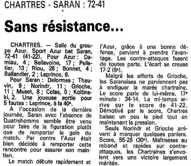 Saison 1988-1989 : Lors de la Journée du 23 Avril 1989, en Championnat de Régionale Féminine 1, Chartres bat Saran
