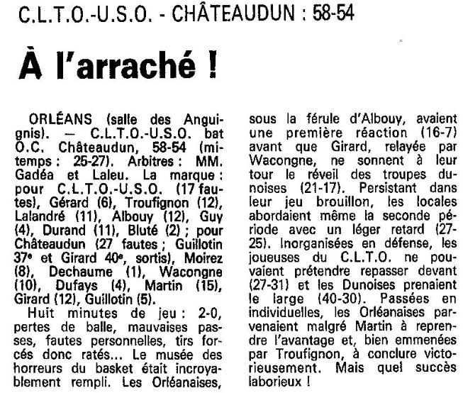 Saison 1988-1989 : Lors de la Journée du 23 Avril 1989, en Championnat de Régionale Féminine 1, le CLTO-USO bat Châteaudun