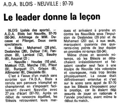 Saison 1988-1989 : Lors de la Journée du 23 Avril 1989, en Championnat de Régionale Masculine 1, l’ADA Blois bat Neuville