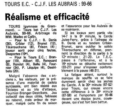 Saison 1988-1989 : Lors de la Journée du 23 Avril 1989, en Championnat de Régionale Masculine 1, Tours EC bat CJF Les Aubrais