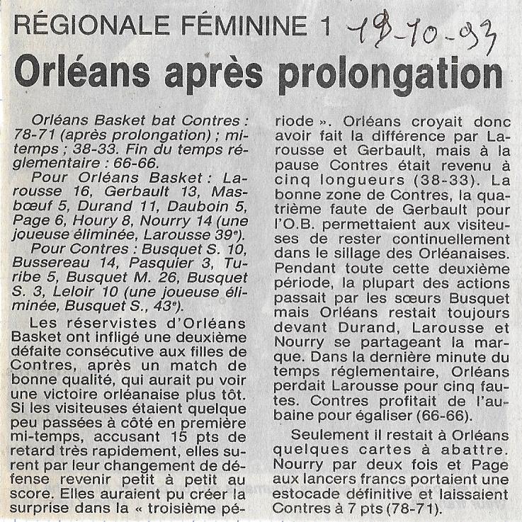 Saison 1993-1994 : En Championnat Régionale Féminine 1, Orléans Basket bat Contres