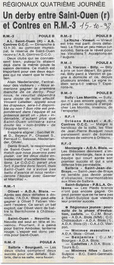 Saison 1993-1994 : Programme de la 4ème Journée des Championnats Régionaux pour les équipes du Loir et Cher