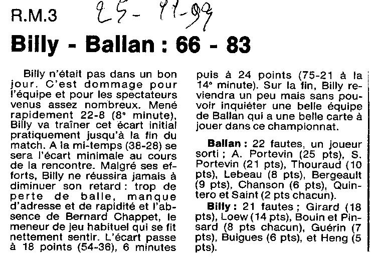 Saison 1993-1994 : En Championnat Régionale Masculine 3, Ballan bat Billy