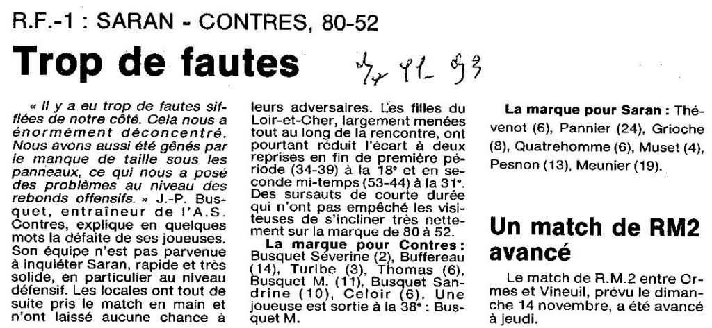Saison 1993-1994 : En Championnat Régional Féminine 1, Saran domine Contres