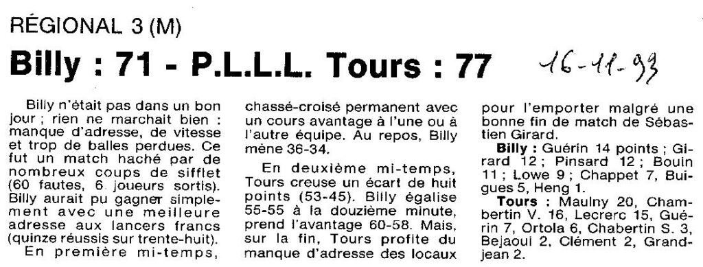 Saison 1993-1994 : En Championnat de Régionale Masculine 3, Billy s’incline à domicile face au PLLL Tours