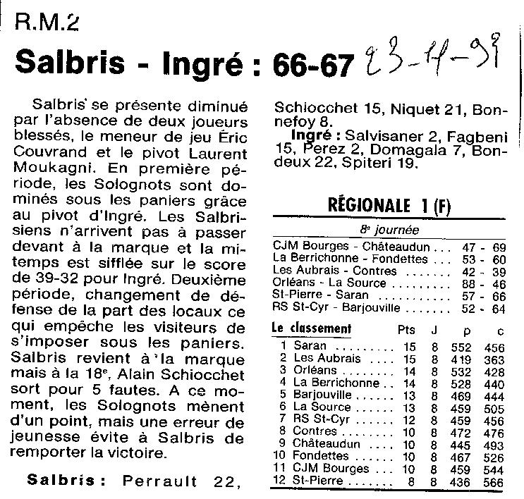 Saison 1993-1994 : En Régionale Masculine 2, Ingré s’impose à Salbris