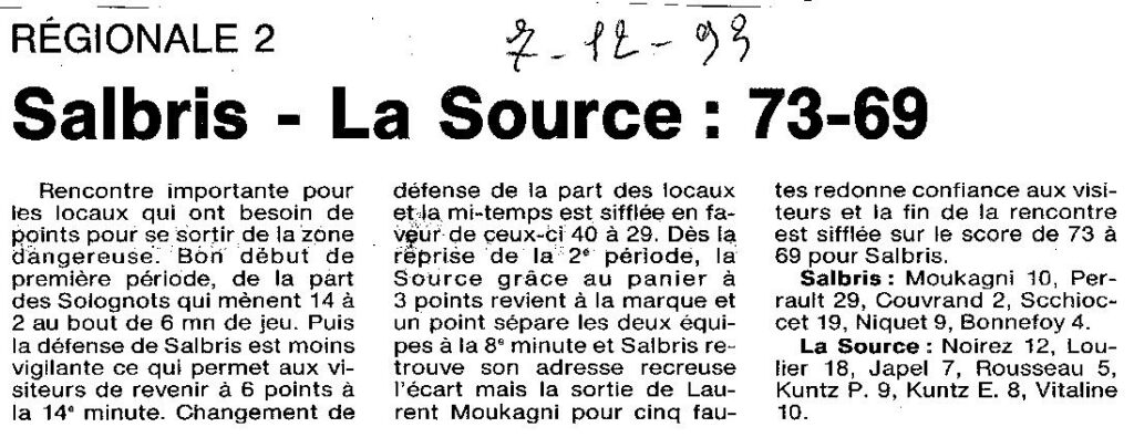 Saison 1993-1994 : En Championnat de Régionale Masculine 2, Salbris bat La Source