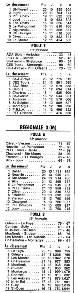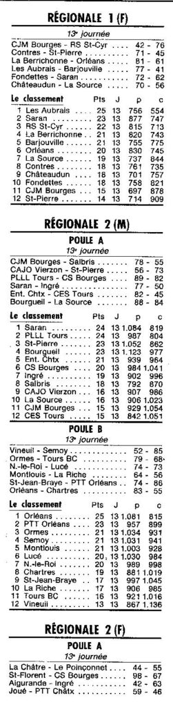 Saison 1993-1994 : Résultats et Classements de tous les Championnats Régionaux après la 13ème Journée