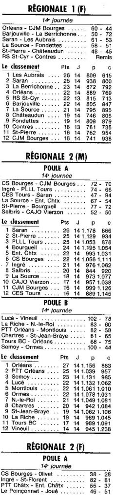 Saison 1993-1994 : Résultats et Classements de tous les Championnats Régionaux après la 14ème Journée