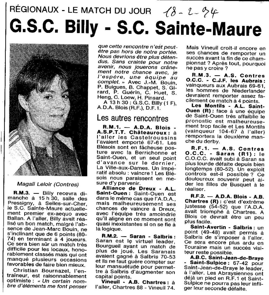 Saison 1993-1994 : En Championnat Régionale Masculine 3, Billy bat Sainte Maure »