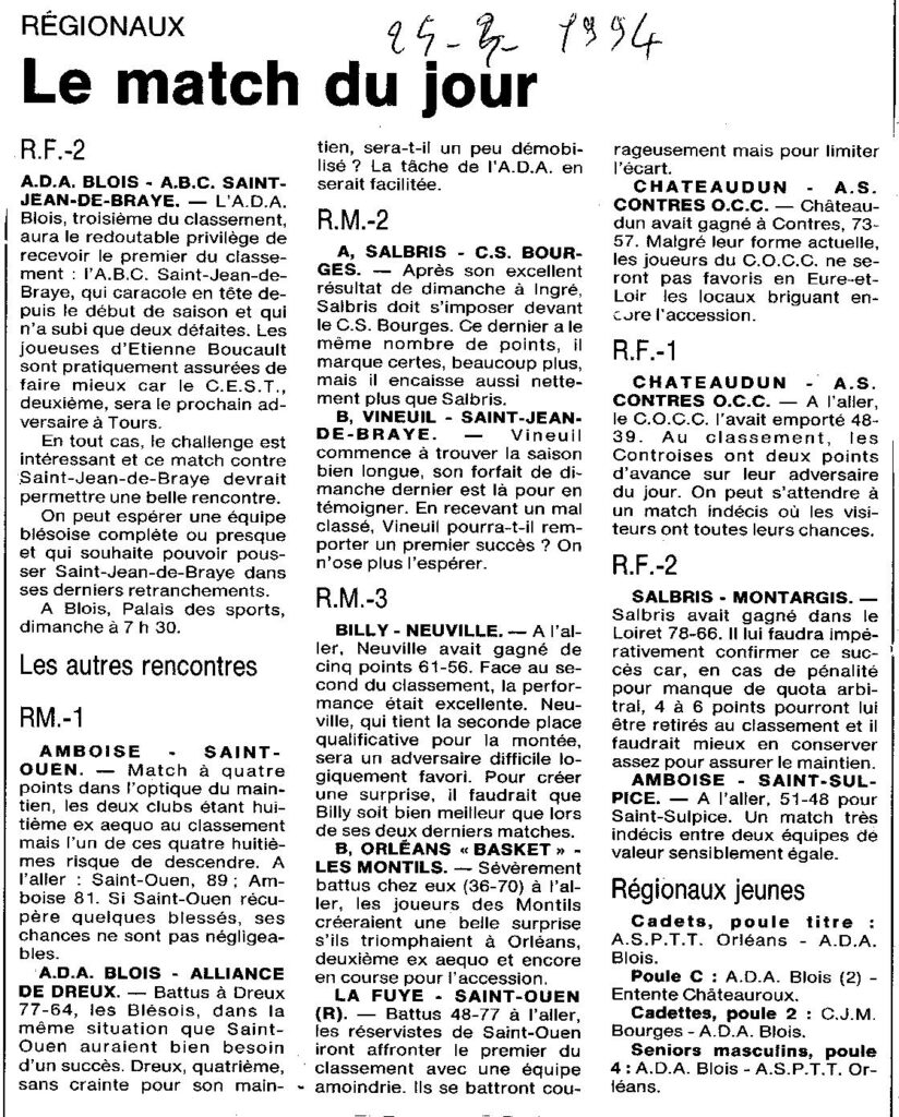 Saison 1993-1994 : Programme de la 20ème Journée des équipes du Loir et Cher dans les Championnats Régionaux