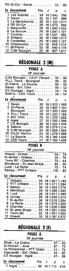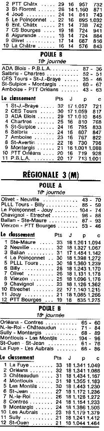 Saison 1993-1994 : Résultats et Classements de tous les Championnats Régionaux après la 18ème Journée