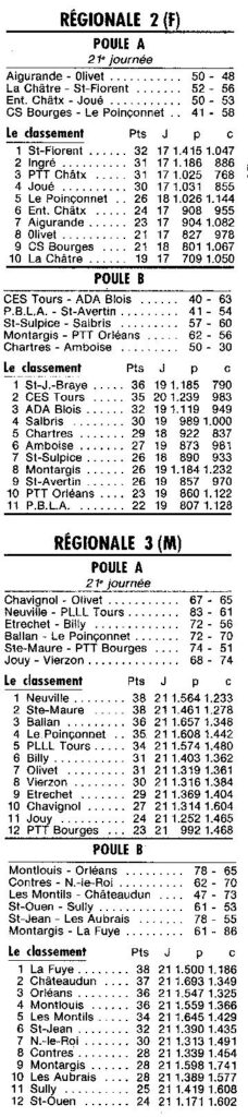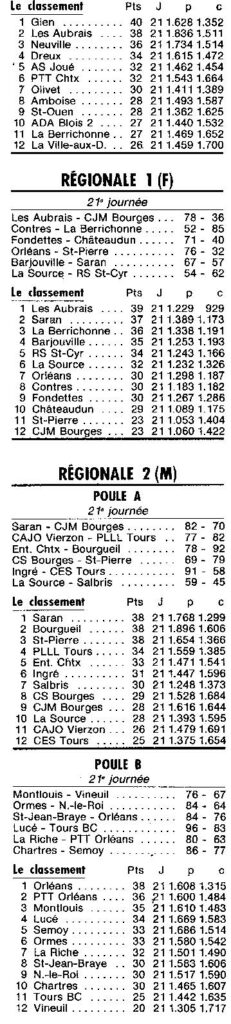 Saison 1993-1994 : Résultats et Classements de tous les Championnats Régionaux après la 21ème Journée