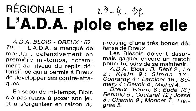 Saison 1993-1994 : En Régionale Masculine 1, l’Alliance de Dreux bat l’ADA Blois (R)