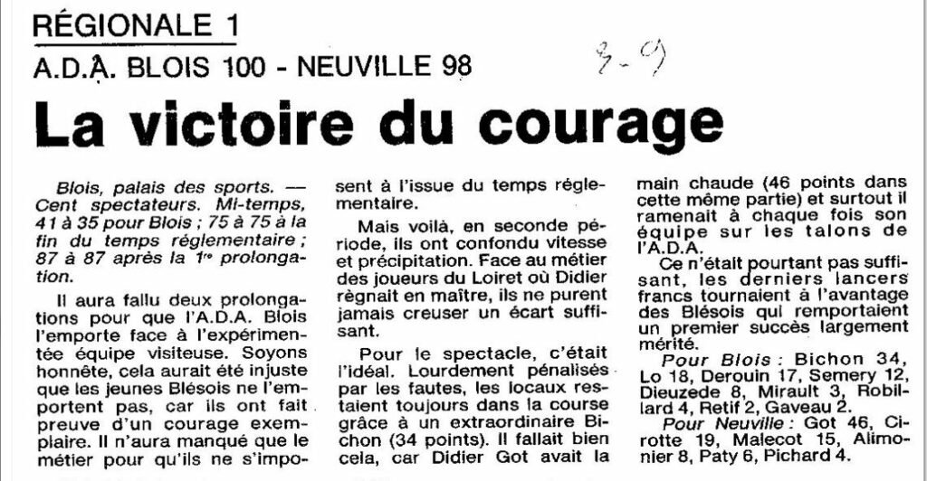 Saison 1994-1995 : En Championnat de Régionale Masculine 1, l’ADA Blois s’impose à Neuville aux Bois