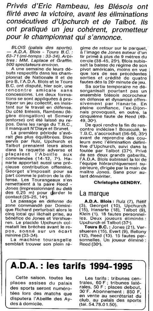 Saison 1994-1995 : L’ADA Blois affronte le Tours Basket Club en match amical