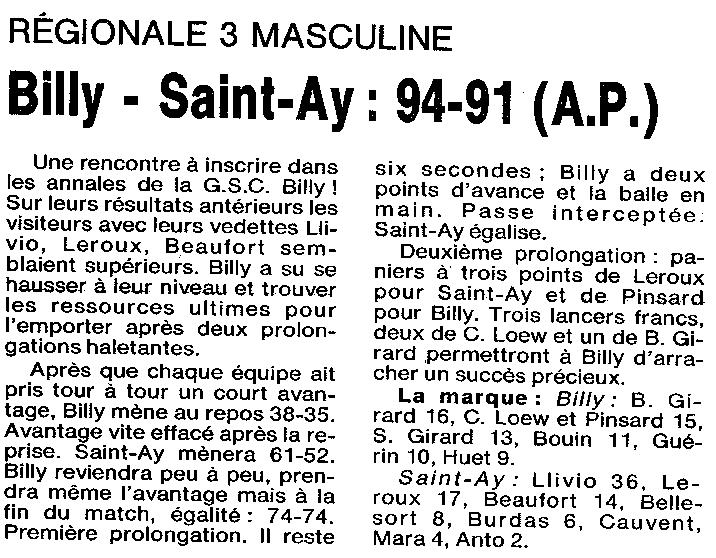Saison 1994-1995 : En Championnat Régionale Masculine 3, Billy bat St AY